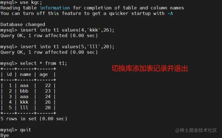 insert into t1 values(4,'kkk',26);