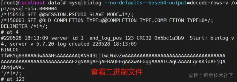 mysqlbinlog --no-defaults--base64-output=decode-rows-v /opt/mysql-bin.000004