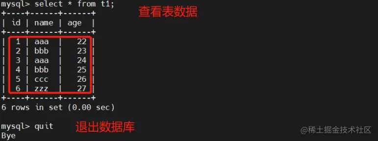 create table t1(id int primary key,name char(4),age int);
