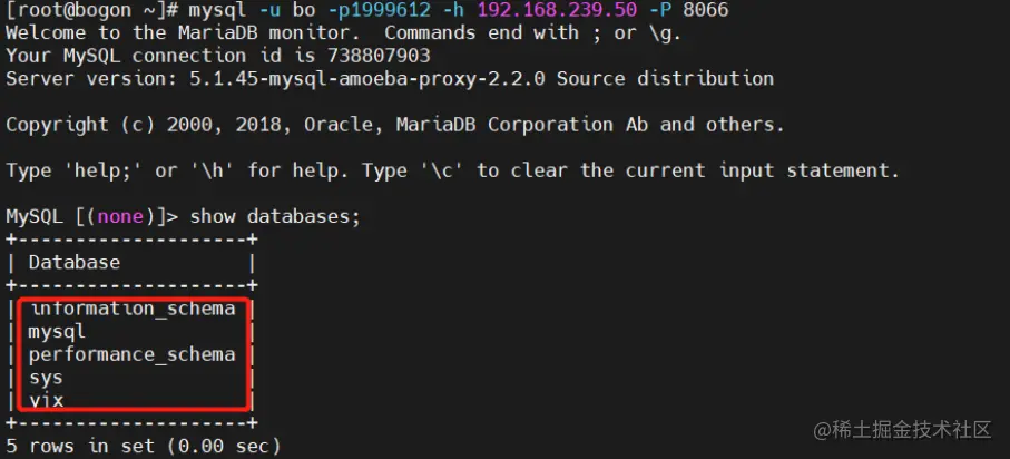 mysql -u bo -p1999612 -h 192.168.239.50 -P 8066 #登入并查看数据库