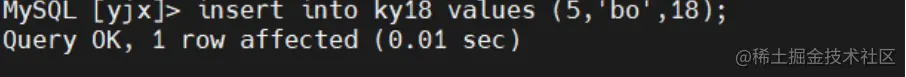 insert into ky18 values (4,'geng',18); 插入数据记录