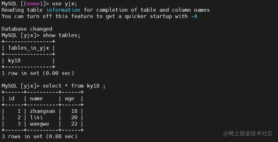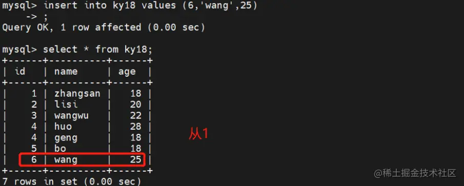 insert into ky18 values (6,'wang',25);