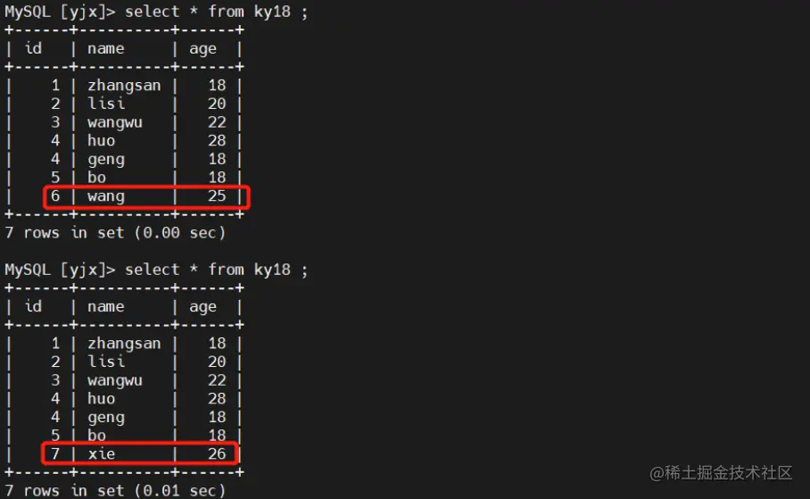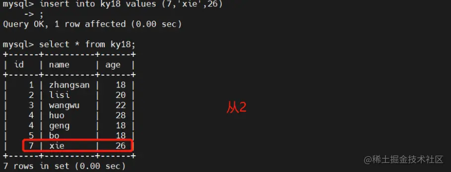 insert into ky18 values (7,'xie',26);