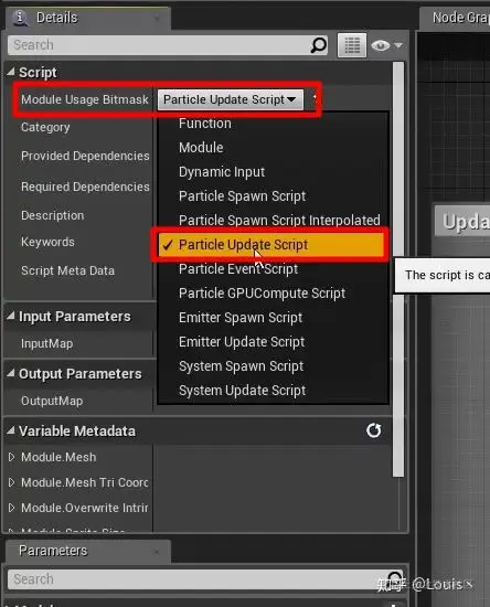 之后来制作我们的变换模块, 打开 Ns_Md_T , 请先将模块的使用范围限定在 Particle Update Script(粒子更新脚本),控制我们的模块在该区域使用。