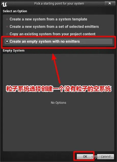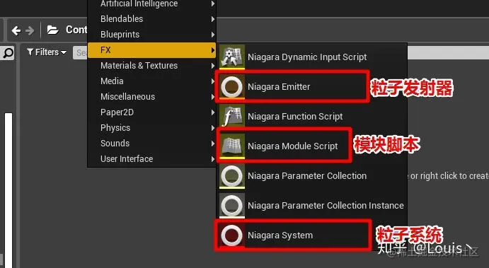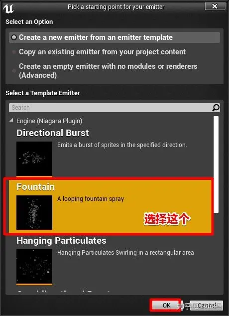 创建粒子发射器和系统, 粒子发射器(选择喷泉 Fountain 模板), 以及我们的 Niagara 模块脚本
