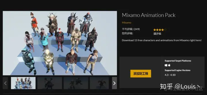 再导入我们的骨骼模型. 这里我用的是官方的 Mixamo Animation Pack, 我们可以在虚幻商城中下载之后添加到我们的工程目录当中. 当然也可以使用我们自己的其它模型资源.