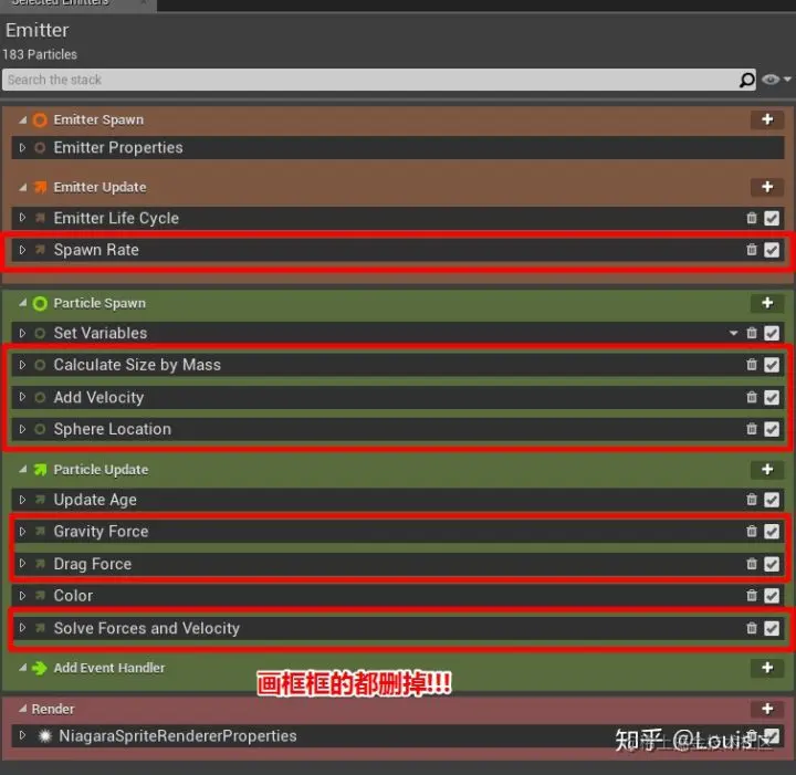 打开粒子发射器 NE_Morph_T , 这里我们需要删除我们不需要的组件: