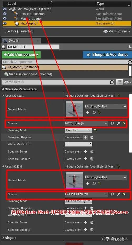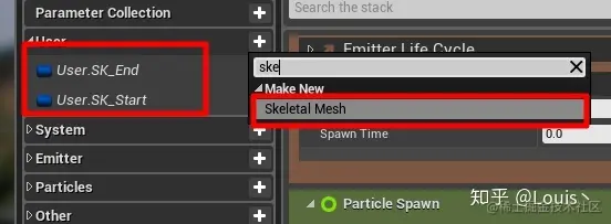 在 Parameters 下的 User 分组中创建两个 Skeleton Mesh 的变量,并分别命名为 User.SKStart 和 User.SK_End. 创建好后将我们的粒子系统扔到场景中就会将我们创建的两个变量暴露到粒子系统的细节面板~ 这样就可以获取场景中的某个实例了.