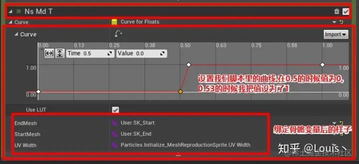 接下来我们在中间填写逻辑, 这里我们需要创建几个变量, 第一个和第二个都是Module下的 SkeletonMesh, 命名为Module.StartMesh 和 Module.EndMesh, 之后要获得 UV 的 width 值,可以通过 Map Get 获得 BeginDefaults 来传进来,之后添加 Module 下 Curve For Float 曲线来控制混合参数,最后一个是将曲线单位化的节点 Particles.NormalizedAge. 大概的思路就是获得两个模型的世界位置,并给一个随机的三角面 UV, 通过 Lerp 将各个参数融合.(这里参考了官方 Particle Spawn>Update Mesh Reproduction Sprite 脚本的实现方法,如果感兴趣可以去研究下)