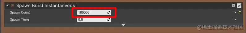 在 Emitter Update 中创建 Spawn Burst Instantaneous 模块,用来设置爆发粒子的数量, 这里我们设置 Spawn Count 为 100000 (按照实际效果可自行调节)