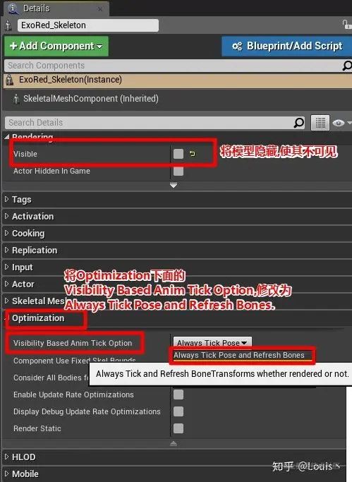 将模型 visible 的 √ 去掉,使其不可见,同时将 Visibility Based Anim Tick Option 的选项改为 Always Tick Pose and Refresh Bones . 否则我们的粒子不会随着模型的动画进行渲染.