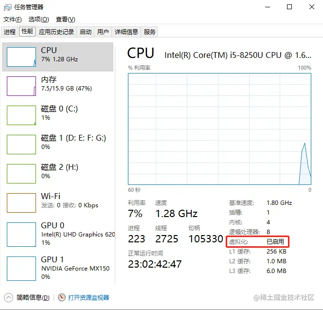 1、首先任务管理切换到性能选项卡,查看虚拟化是否已经启用,如果没有启用的话,就需要先启动CPU虚拟化,如果你的电脑不支持CPU虚拟化,那么就不需要再往下看了,如果还需要在自己电脑上体验别的操作系统,就需要安装VMware、VirtualBox 等软件来满足你的要求。