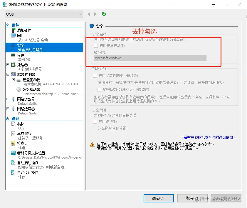 这个时候虚拟机就会启动不了,我们需要在设置里面把安全启动的复选框去掉勾选即可。具体如下图: