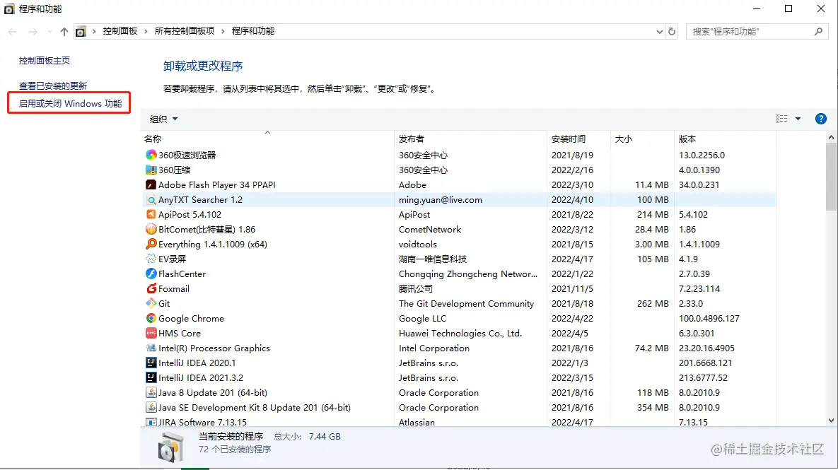 2、控制面板打开程序功能 然后点击 启用或关闭Windows功能