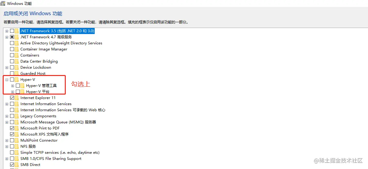 3、找到Hyper-v 全选然后进行虚拟机服务的安装