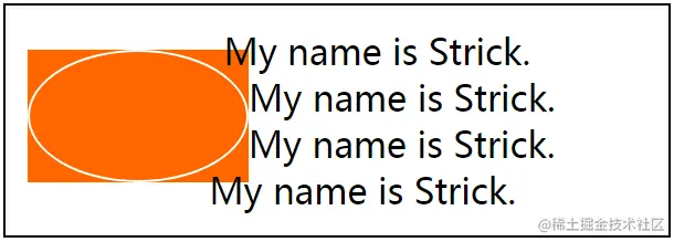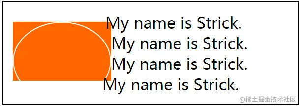 第二种是椭圆,与圆形类似,也需要定义半径和圆点位置。只是它需要两个半径,第一个是横轴半径,第二个是纵轴半径。在下面的示例中,浮动元素的宽为100px,高为60px,将浮动形状声明为椭圆,效果如下图所示。