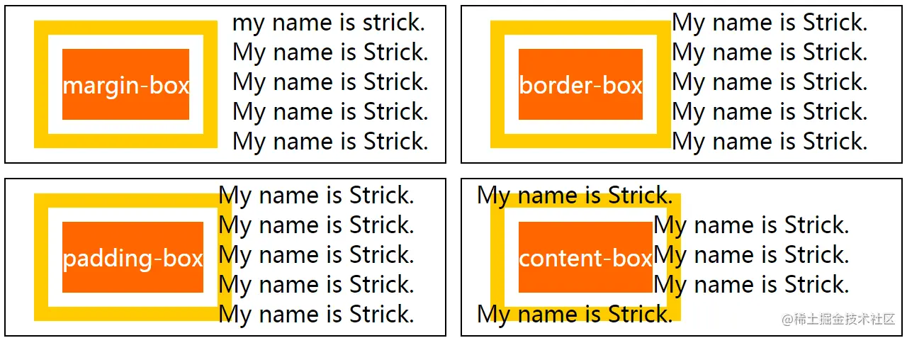 下图演示了四种形状盒子的效果,外边距、边框和内边距都设为了10px,代码中只列出了关键样式,并只举了其中的一种情况。