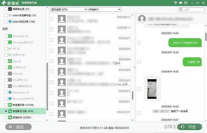 第四步: 如果您不想恢复好友,只想恢复聊天记录的话,那么可以直接点击【微信聊天记录】,从中找到需要恢复的聊天记录,选择完毕后,点击右下角的【恢复】就可以了。
