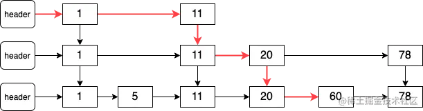 跳表的优化思路是添加上层链表,上层链表中会跳过一些节点。如图所示: