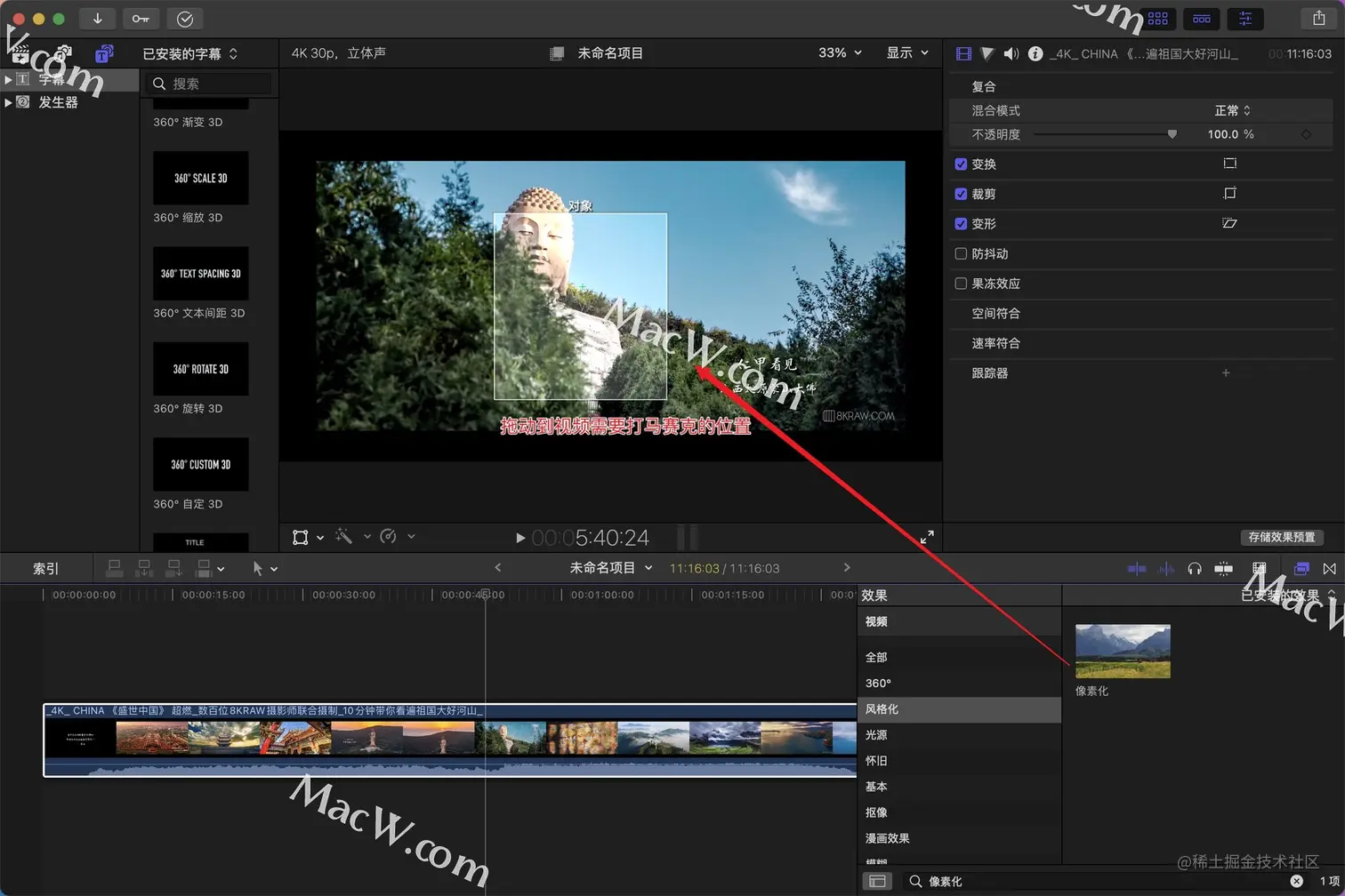 鼠标左键按住像素化拖动到上方视频需要添加马赛克的位置,如图