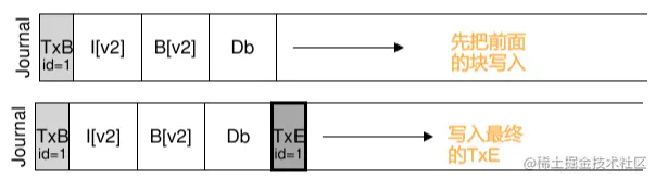 但是这样有一个问题,如果写入日志是一个个进行的,就很缓慢。所以我们希望成批的写入日志来提高效率,但是如果在这一过程中发生崩溃的话,则在恢复后重写进行操作时将错误信息也写入磁盘,这相当于没有日志。如何处理这个问题呢?①在ext4中,日志的写入是成批的,但是会在写入后总体更新前进行校验,如果校验不通过,则将这一段的更新全部抛弃。②而在ext4之前,日志的写入是分两阶段的,先将除TxE以外的所有消息写入日志块,确认可以完成写入后将TxE写入日志,这一阶段叫做日志提交。