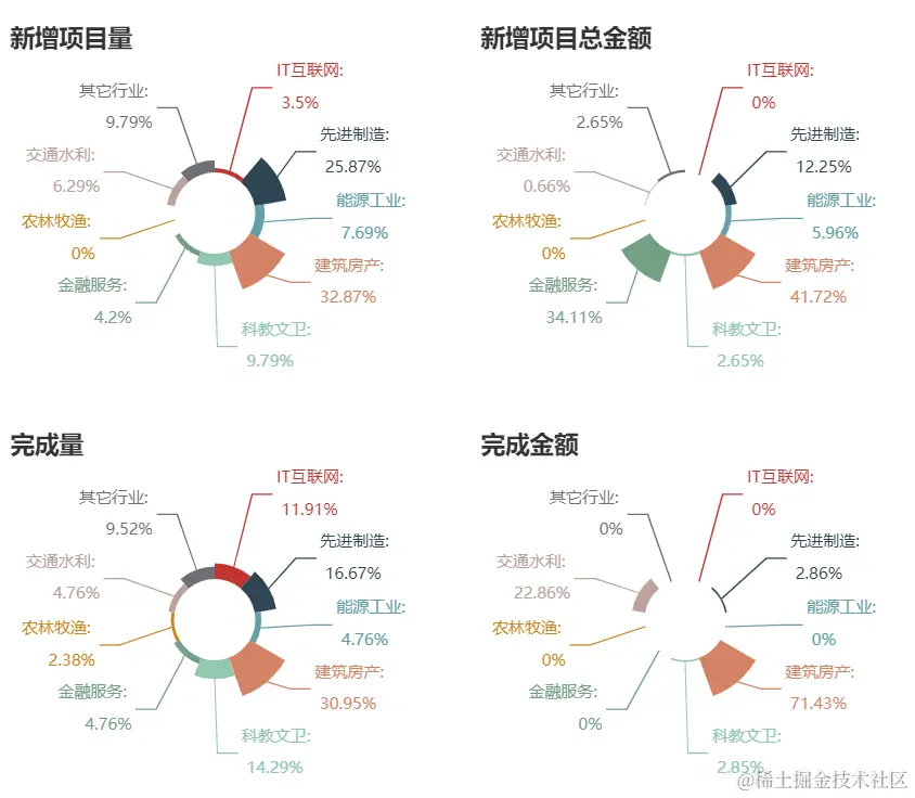 塔米周报按照行业对新增项目量、新增项目总金额、完成项目量、完成项目金额进行了统计并可视化展示。