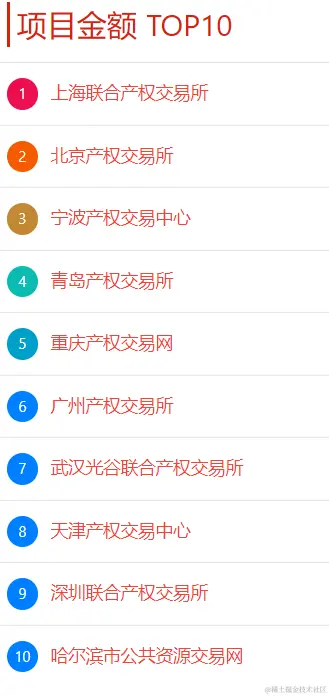 本周交易机构新增披露项目金额排名TOP10有:上海联合产权交易所、北京产权交易所、宁波产权交易中心、青岛产权交易所、重庆产权交易网、广州产权交易所、武汉光谷联合产权交易所、天津产权交易中心、深圳联合产权交易所、哈尔滨市公共资源交易网