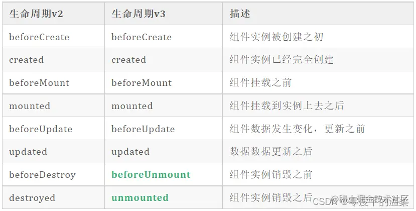 2.Vue生命周期总共可以分为8个阶段:创建前后, 载入前后, 更新前后, 销毁前后,以及一些特殊场景的生命周期。vue3中新增了三个用于调试和服务端渲染场景。