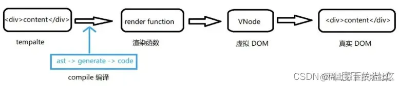 - 在Vue中编译器会先对template进行解析,这一步称为parse,结束之后会得到一个JS对象,我们成为抽象语法树AST,然后是对AST进行深加工的转换过程,这一步成为transform,最后将前面得到的AST生成为JS代码,也就是render函数。