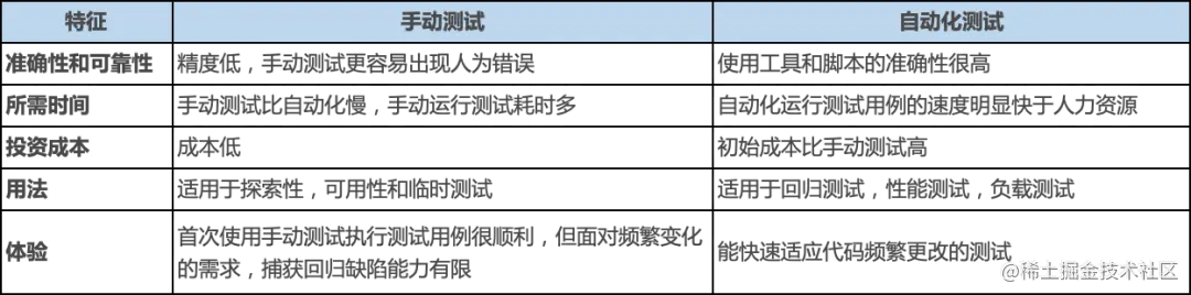 通过以下对比,让我们来了解测试工作中手工测试与自动化测试之间的区别。