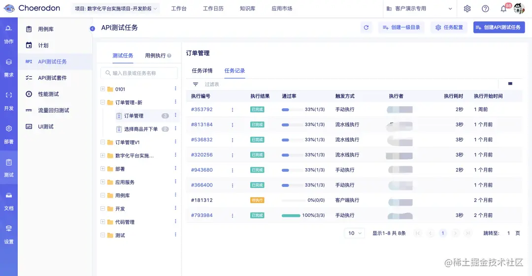 猪齿鱼Choerodon目前支持的自动化测试有:API测试、性能测试、流量回归测试、UI测试,允许测试人员通过关键测试信息来完成测试操作,无需编程。