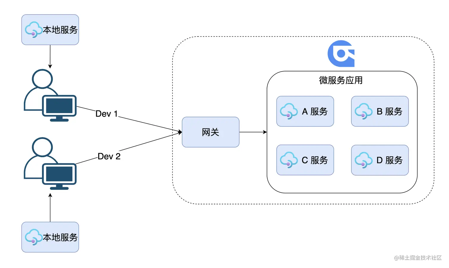 以前我们在本地 + Rainbond 开发微服务时,要开发的模块我们运行在本地,其他模块运行在 Rainbond 上,我们通过 Rainbond 的网关与本地进行通信、联调。