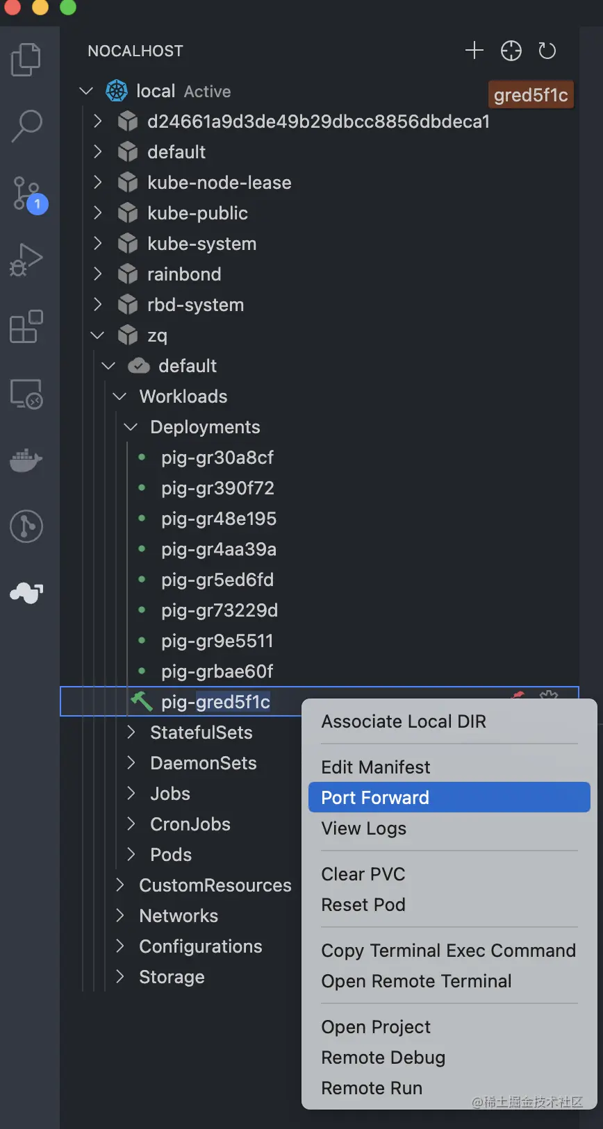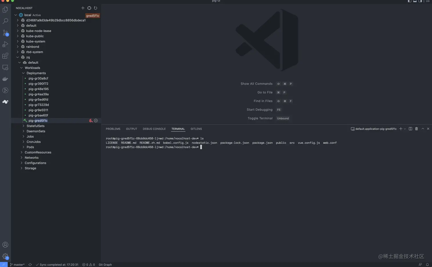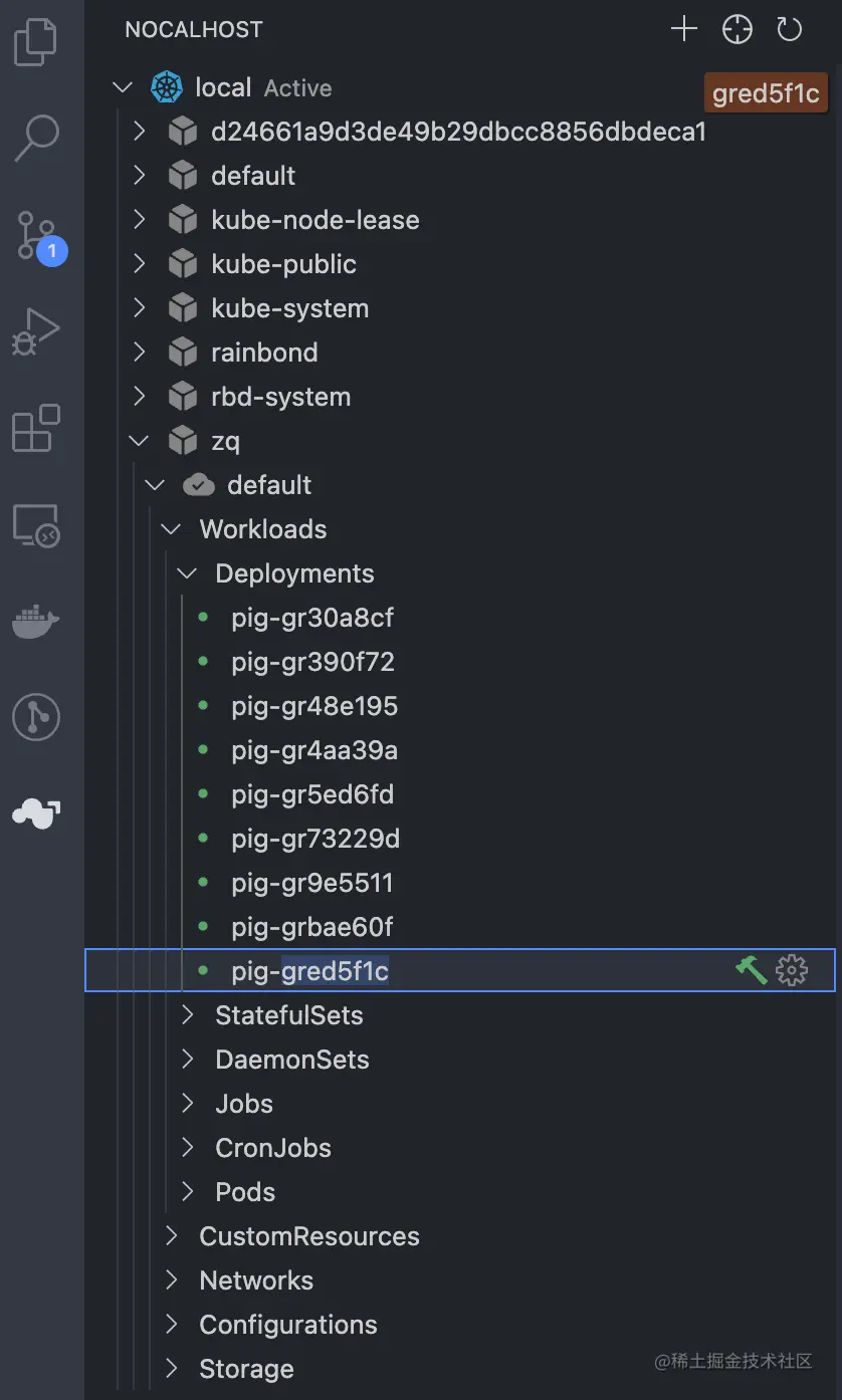 打开 Vscode,点击按钮 ,找到我们的 Pig-ui 组件,由于该应用是从开源应用商店中安装,Deployment名称是自动生成的字符串,我们需要在组件中查询下。