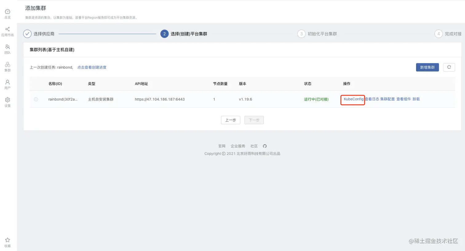 kubeconfig文件,进入 Rainbond 集群视图 -> 点击节点配置 -> kubeconfig