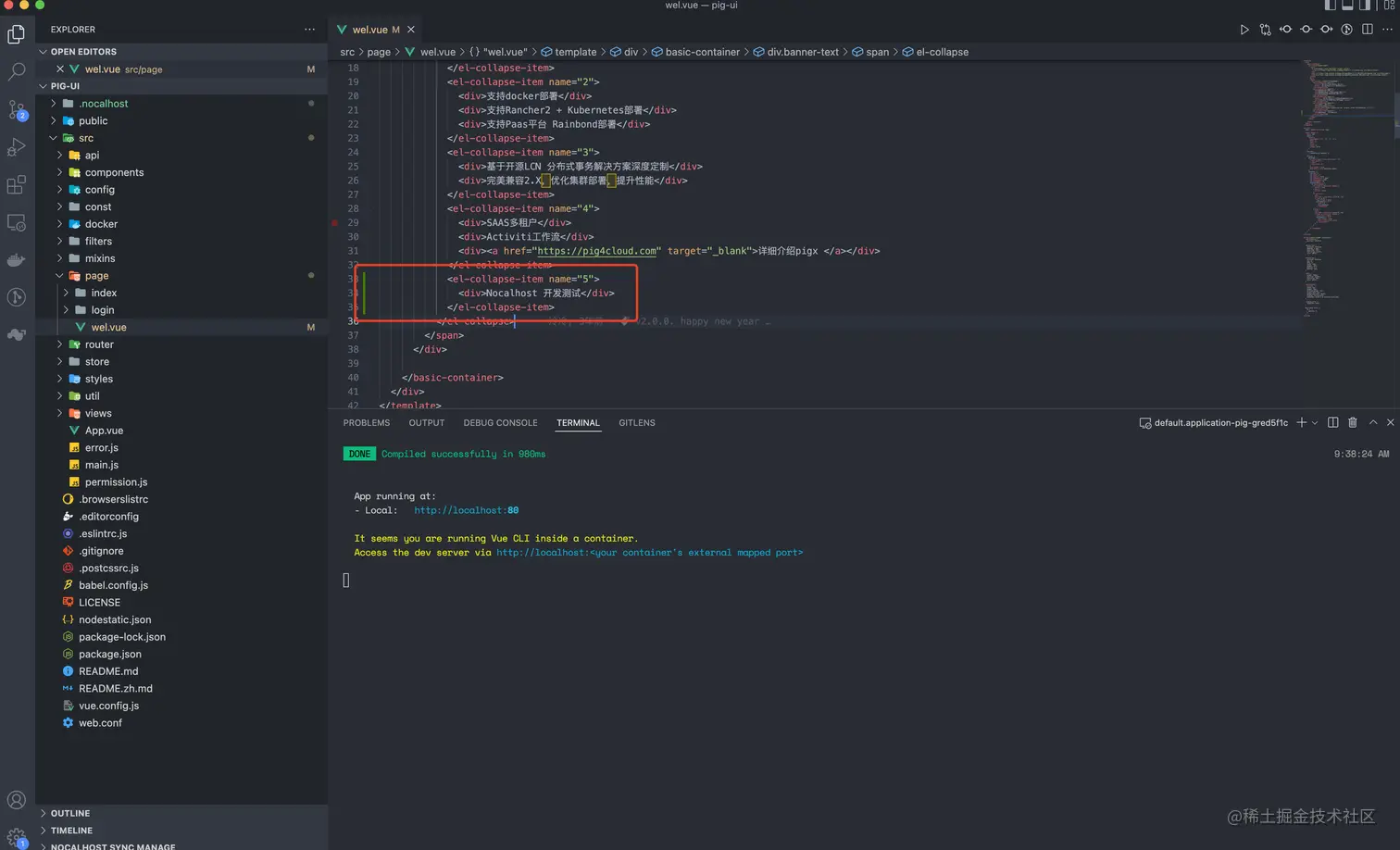修改 src/page/wel.vue,新增一段代码,保存。可以发现,当我们保存的时候,终端中就自动重启了,与本地开发效果一致。