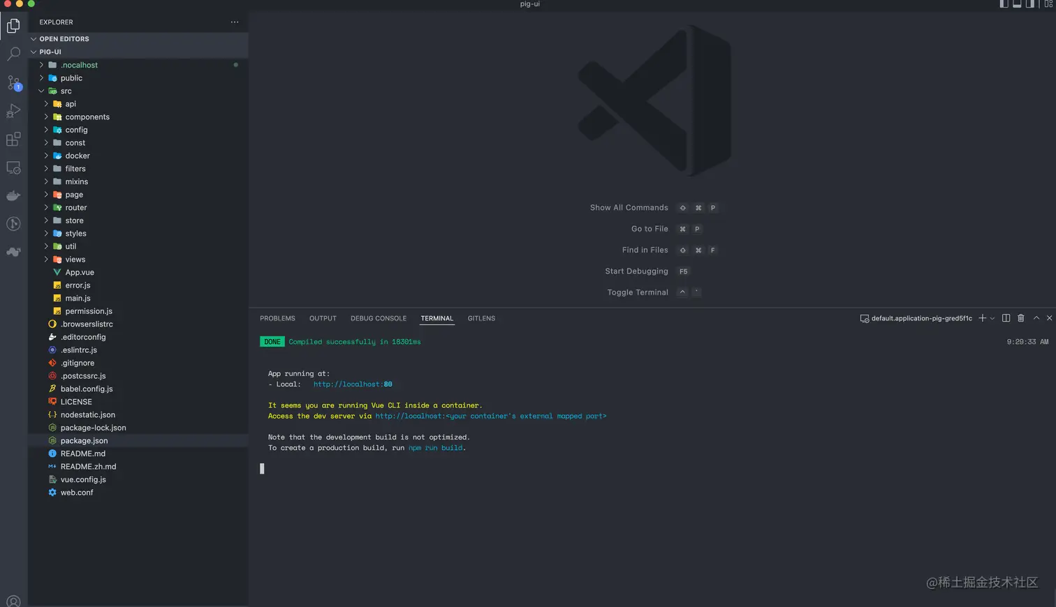 上面我们已经在本地 Vscode 中对接好了集群,并且也已经在 Rainbond 中安装了 Spring Cloud Pig 微服务,那么接下来我们在本地 Vscode 中选择其中一个组件进行开发,这里为了效果更明显,选择开发 pig-ui 组件。