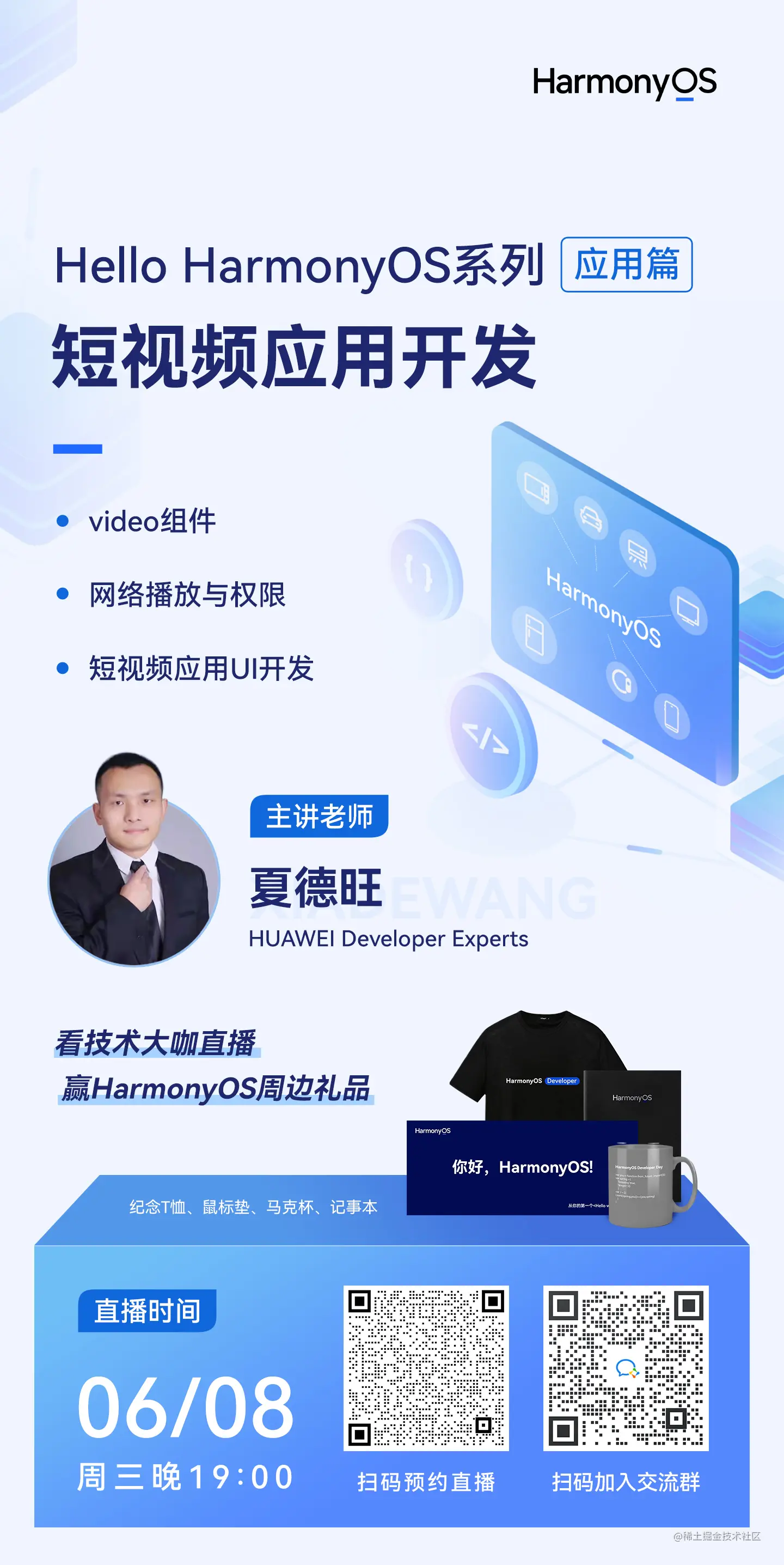 而在本周三(6月8日)19:00,将由HDE夏德旺老师倾情分享如何基于HarmonyOS系统进行短视频应用的开发,深入浅出的赋能开发者。