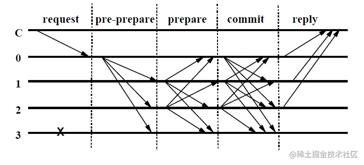 PBFT的算法过程如下图,假设最多有f个恶意节点: