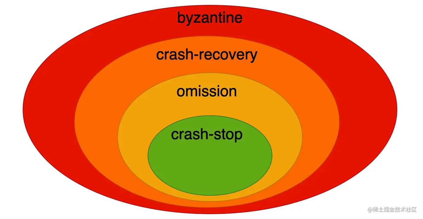 - Crash-stop Failures:故名思议,一旦发生故障,节点就停止提供服务,并且不会恢复。这种故障模型中的节点都按照正确的逻辑运行,可能宕机,可能网络中断,可能延迟增加,但结果总是正确的;