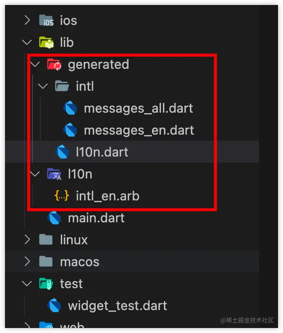 在lib目录下会生成以下文件,在I10n文件夹下边有一个默认的intl_en.arb语言包,arb文件全称Application Resource Bundle(abbr. ARB)是一种本地化资源格式,使用arb文件作为资源配置文件(类似xml)可以提供给翻译人员翻译,他的编辑也是很简单,就像一个json文件,使用key-value格式来录入我们的语言内容。而intl文件夹内的文件,还有I10n.dart都不需要手动编辑,而且不建议大家手动编辑,他们是会根据我们配置的语言包内容自动更新。
