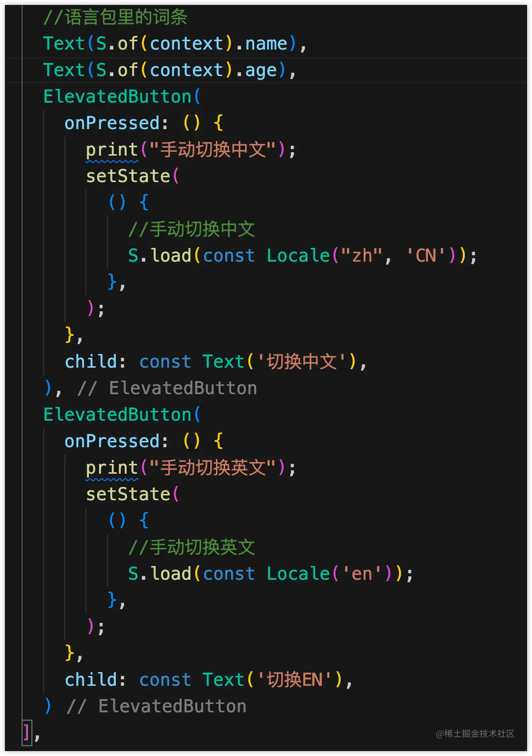 使用就很简单了,在需要国际化的地址,使用S.of(context)来获取一个国际化的实例,属性就是我们在arb中配置的key。