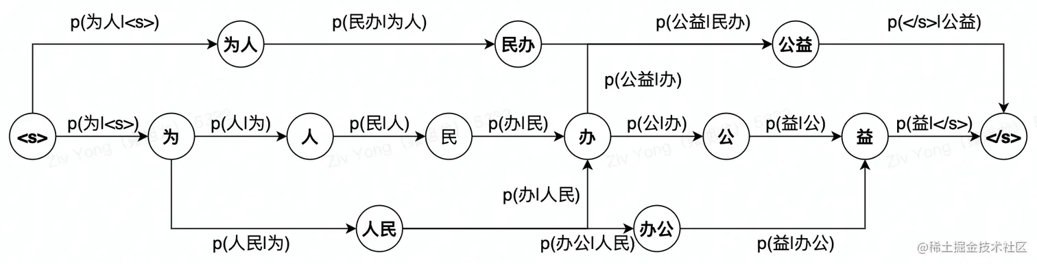 词典为:['为','为人','人民','民办',''办',办公','公益']