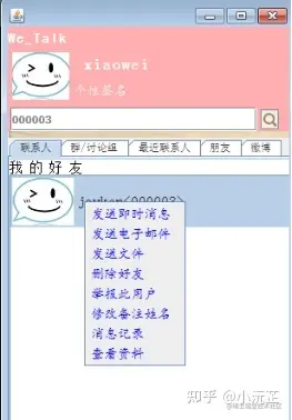 Socket是即时通讯系统实现的核心技术,可以通过端口设置与IP地址来构建通讯的桥梁,以便各类信息的发送与接收。在这个软件中可以与陌生用户或者你已加入用户列表中的用户进行信息的传递来完成基本的交流,系统在后续中是会继续进行功能的完善与拓展,来实现文件传输,语音传输等各种方式来加强用户的体验,为用户带来极大的便利。