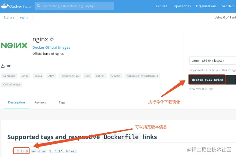 浏览器访问:Docker Hub 1 查看Nginx镜像详细信息。