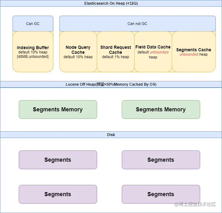 Elasticsearch内存分为on heap以及off heap两部分。Elasticsearch能控制的是On Heap内存部分,这部分由JVM管理;Off Heap由Lucene管理,负责缓存倒排索引数据空间(Segment Memory)。