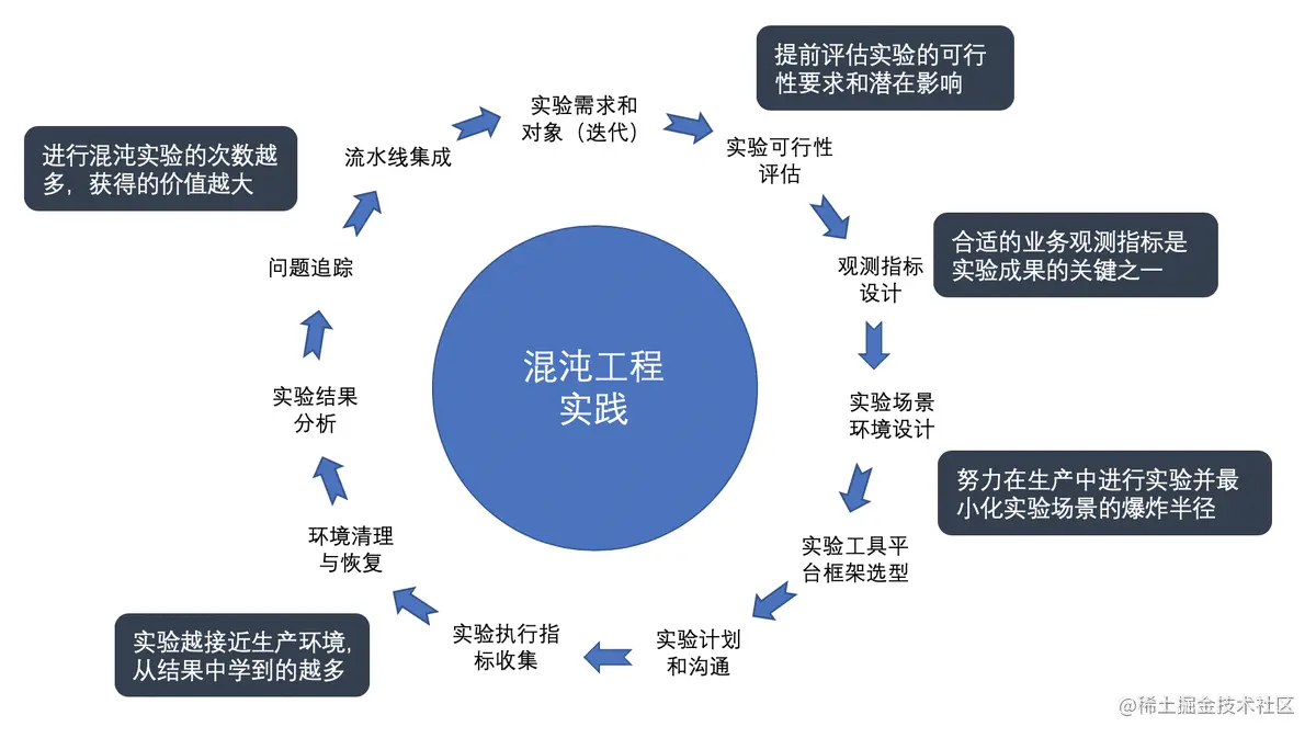 完整的混沌工程实验是一个持续性迭代的闭环体系,大致分为以下几个步骤: