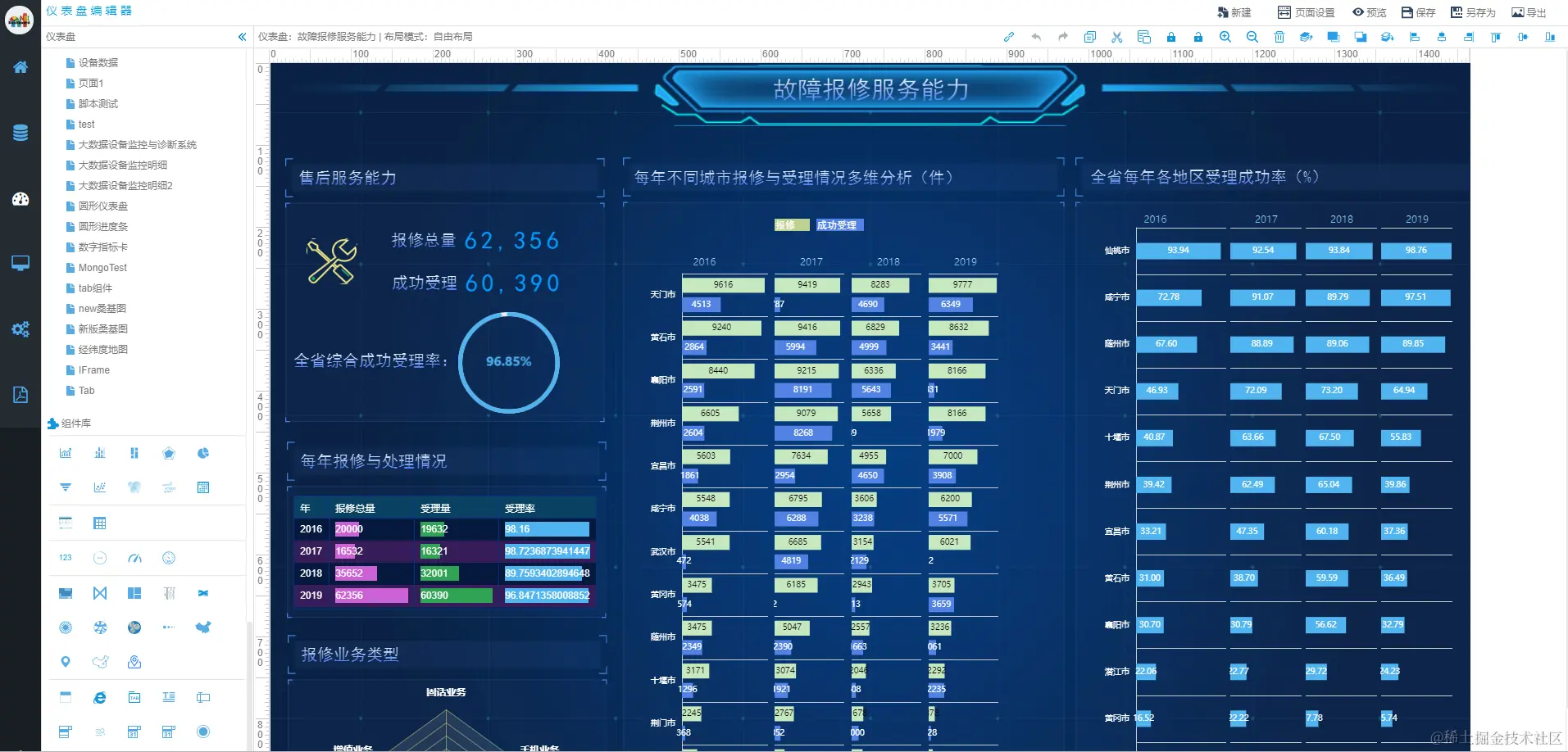 NBI拥有几十种传统图形和新型大数据图形组件(如桑 基图, treemap、层级聚类图、旭日图、热力矩 阵、日历矩阵、gis等等)能让您轻松构建各类炫 酷的数据大屏。