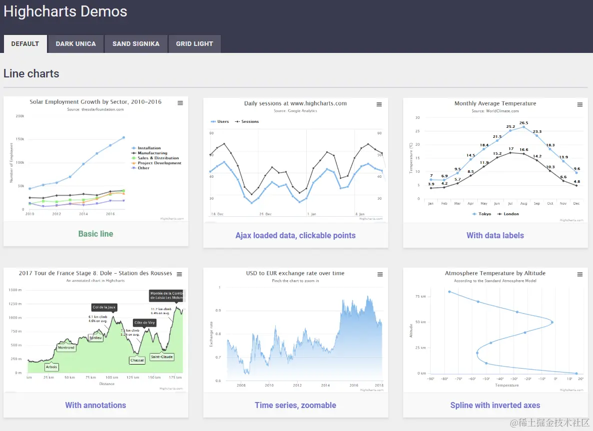 Highcharts同样是可视化库,只不过是国外的,商用的话需要付费。其优势是文档详细, 实例也很很详细,文档中依赖哪些js脚本,css都十分详细,学习和开发都比较省时省力,相应的产品稳定性较强。