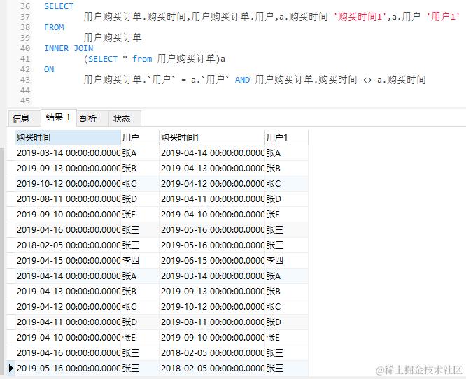 15 用户购买订单.`用户` = a.`用户` AND 用户购买订单.购买时间 <> a.购买时间