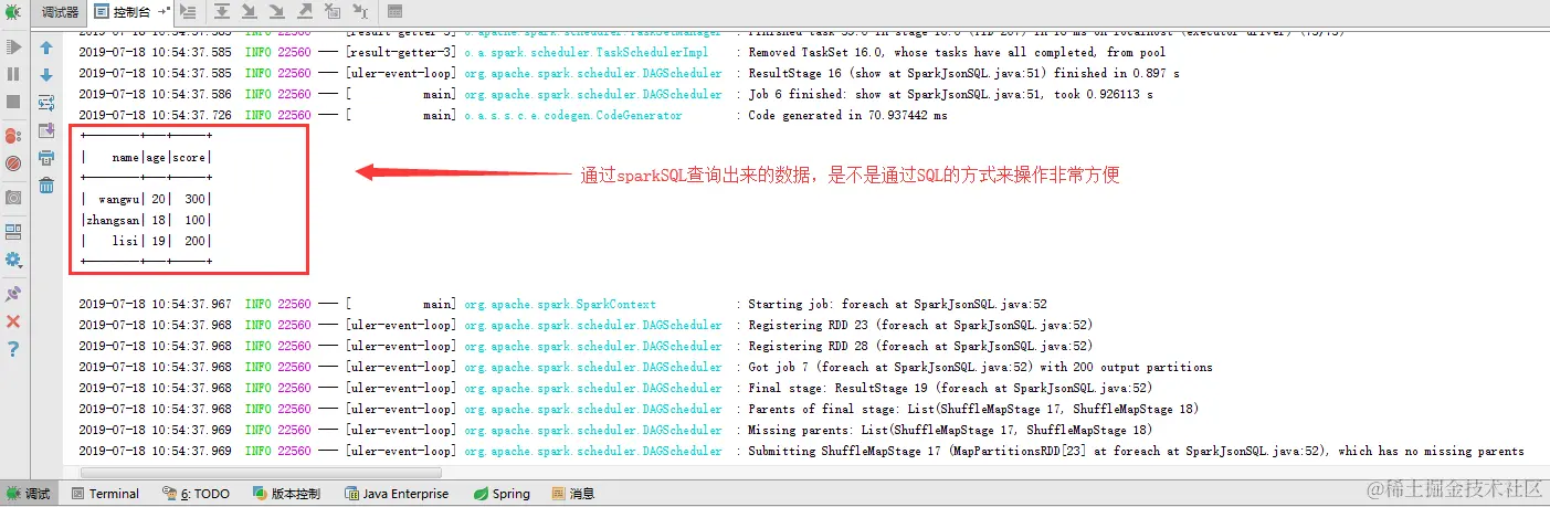 主要给大家演示的场景是将json字符串转换成临时表,然后通过sparkSQL操作临时表,非常简单方便: